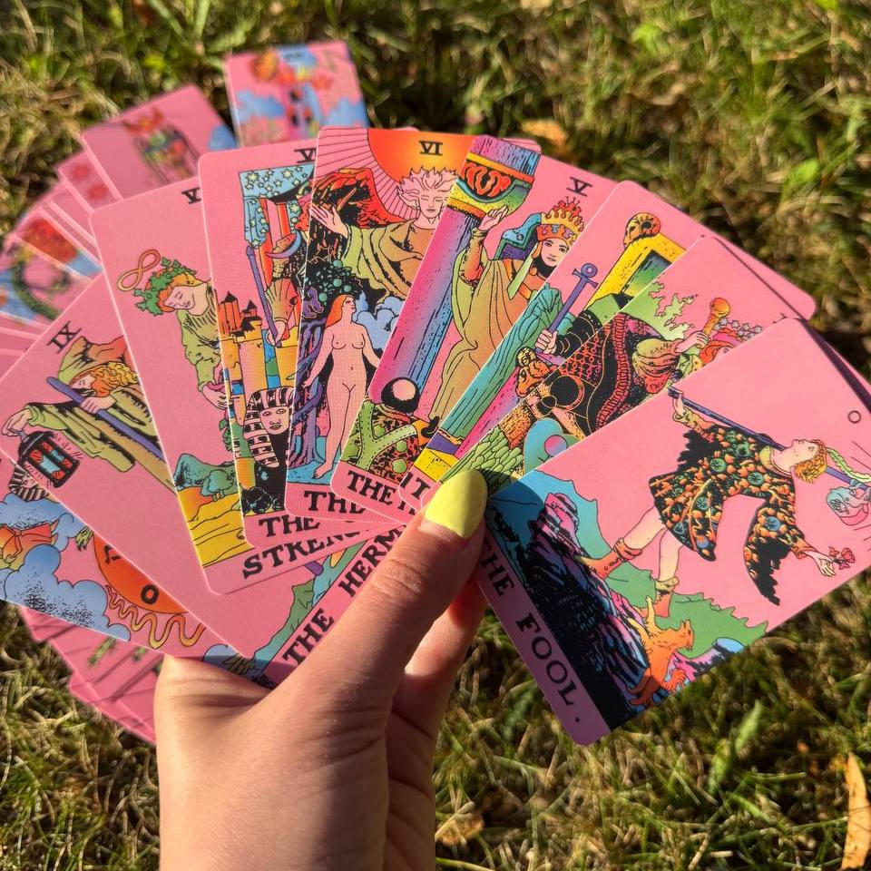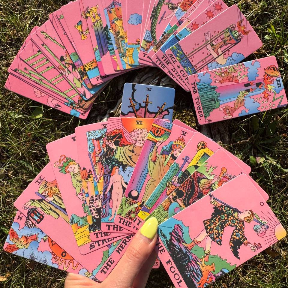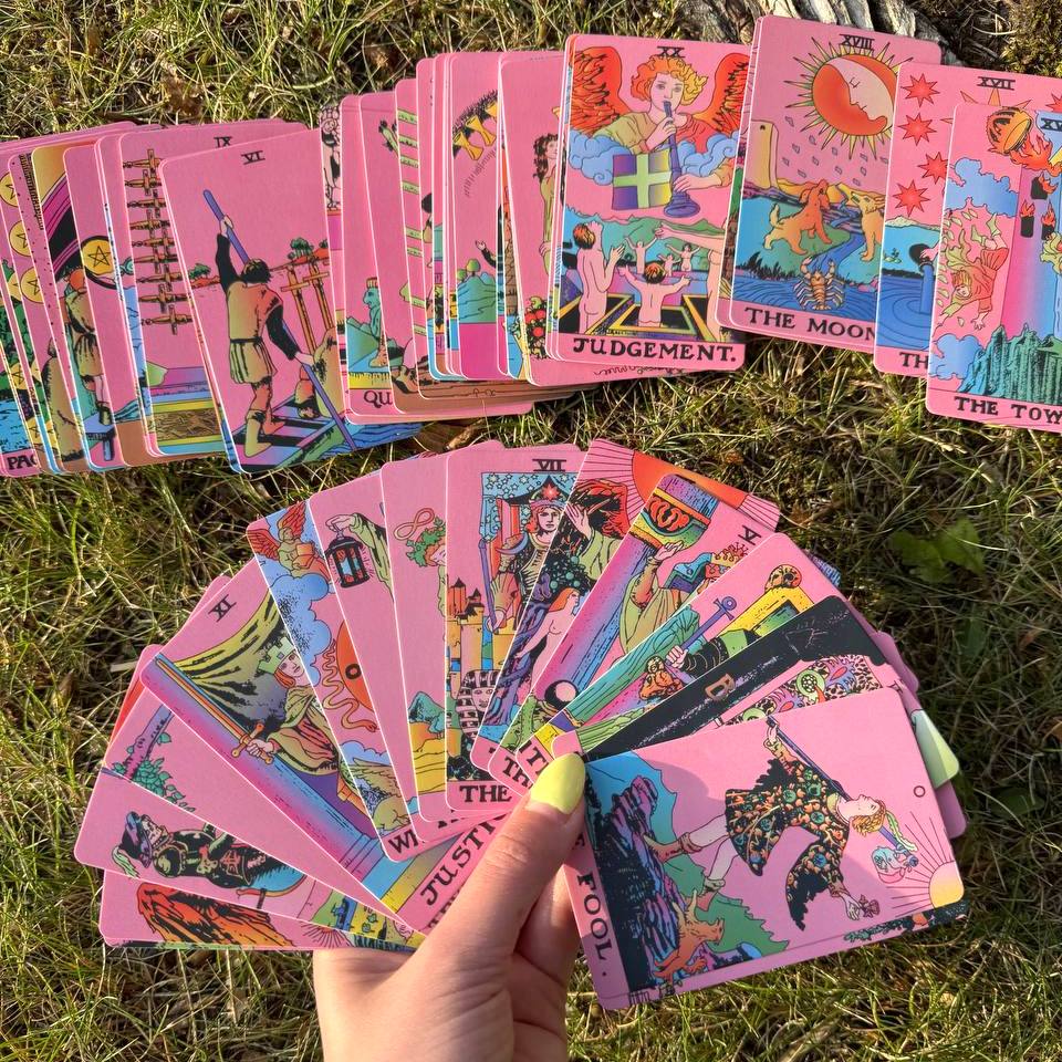 ✨ Tarot Deck (78 cards) – vibrant pink background with classic Rider–Waite symbolism for clear and intuitive readings.